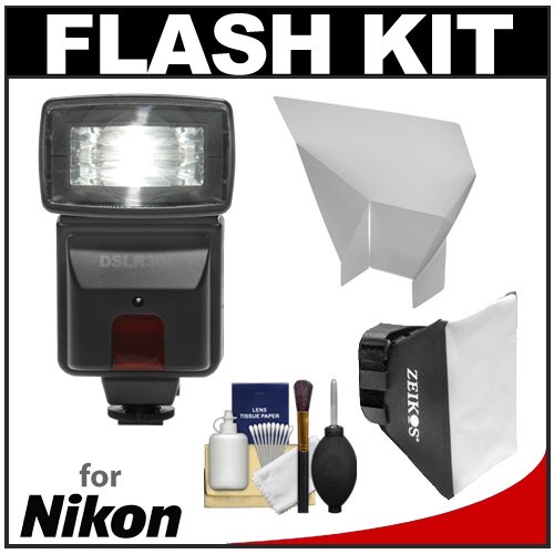 Kit includes: This Precision Design DSLR300 Universal High-Power Flash unit is the perfect accessory for any photographer looking for reduced red-eye, evenly lit subjects, or more power for telephoto shooting. This flash can be effective at ranges of over 50 feet, reduces shadows, and adds depth to your pictures thanks to the adjustable head, which zooms, swivels and tilts for added versatility. The Zeikos Universal Soft Box Flash Diffuser enlarges and redirects the light from the flash and then further softens the light by passing it through a frosted diffuser. Attaches to your flash in seconds. This Precision Design Flash Bounce Reflector can be utilized with nearly any electronic flash in order to create diffused lighting that will greatly enhance your photographs. It reflects indirect light onto the subject, resulting in naturally illuminated images with minimal shadows. This 6-piece cleaning kit contains everything you'll ever need to properly clean your lenses, including a Hurricane Air Blower, Lens Cleaning Tissues, Lens Cloth, Lens Cleaning Liquid, Brush and Cotton Swabs. ...Read more |